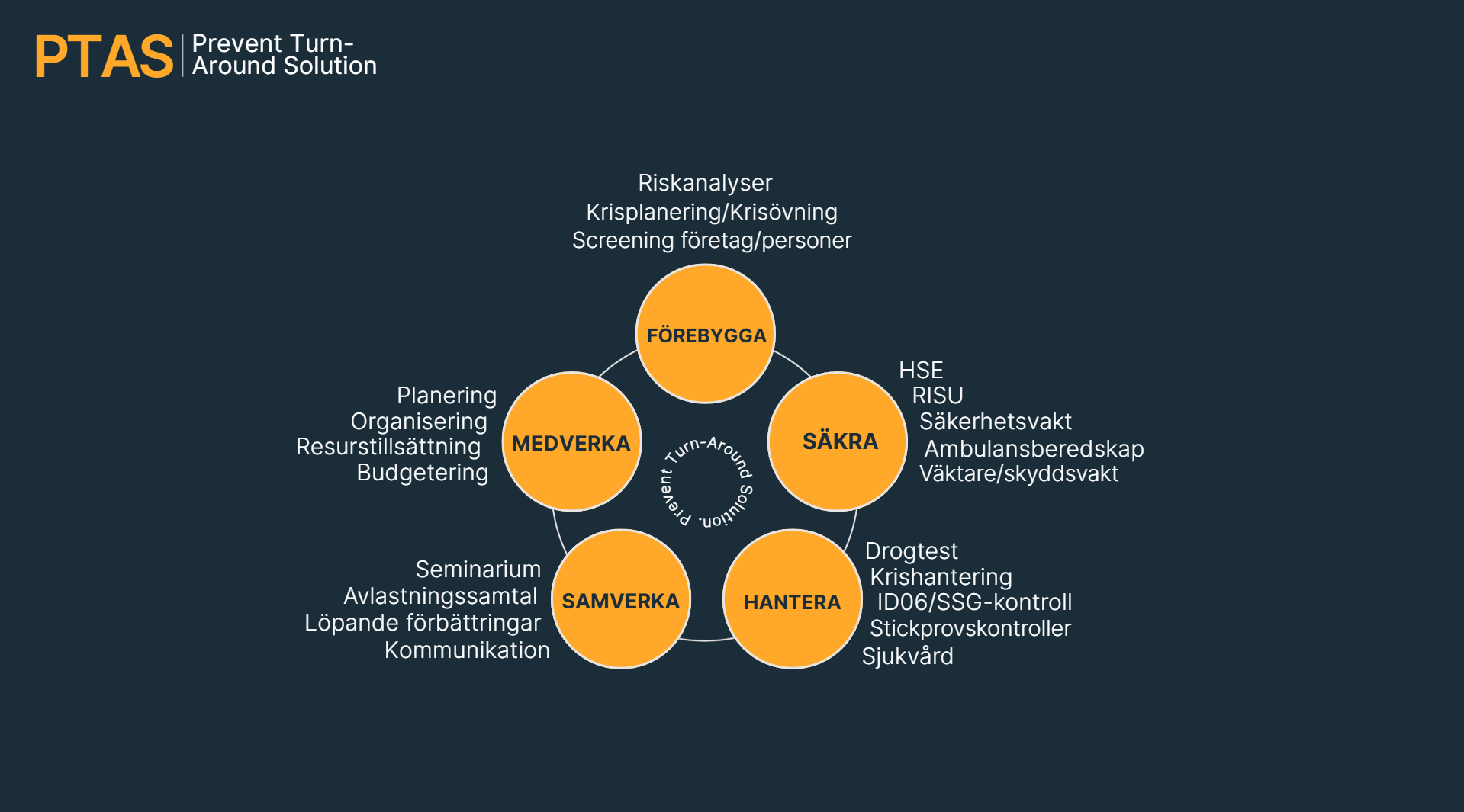 PTAS-modellen är uppbyggd kring fem centrala områden som tillsammans skapar en trygg och effektiv process: